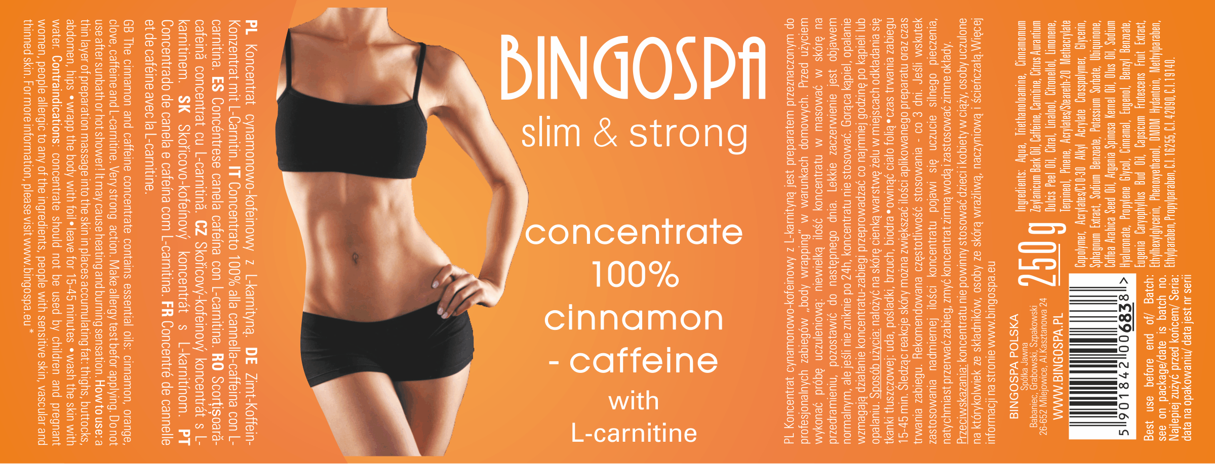 Koncentrat cynamonowo - kofeinowy BINGOSPA z L-karnityną przeznaczony jest do wykonywania samodzielnie zabiegów "body wrapping" (owijania ciała folią w celu wzmocnienia absorpcji przez skórę aktywnych składników). Zawiera maksymalne stężenie aktywnych składników o skutecznym działaniu antycellulitowym i wyszczuplającym: olejek cynamonowy, olejek pomarańczowy, olejek goździkowy i kofeinę. Składniki te również pozytywnie wpływające na kondycję zewnętrznej powierzchni skóry.