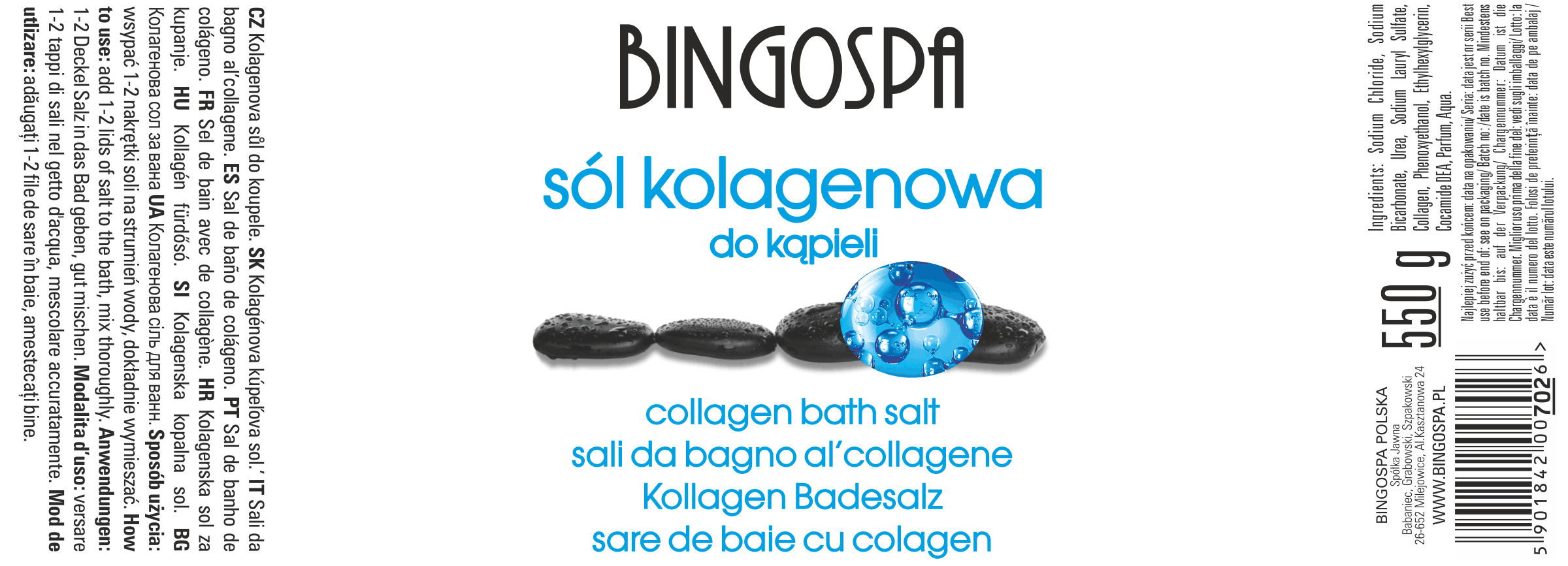 Sposób użycia: do kąpieli kolagenowych: do wody o temp. 40°C wsypać 2 płaskie nakrętki soli. Przebywać w kąpieli 20 minut. Następnie ciało spłukać wodą i zawinąć w ręcznik na kilka minut.